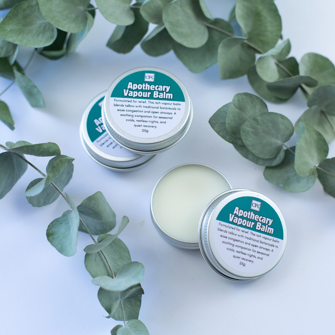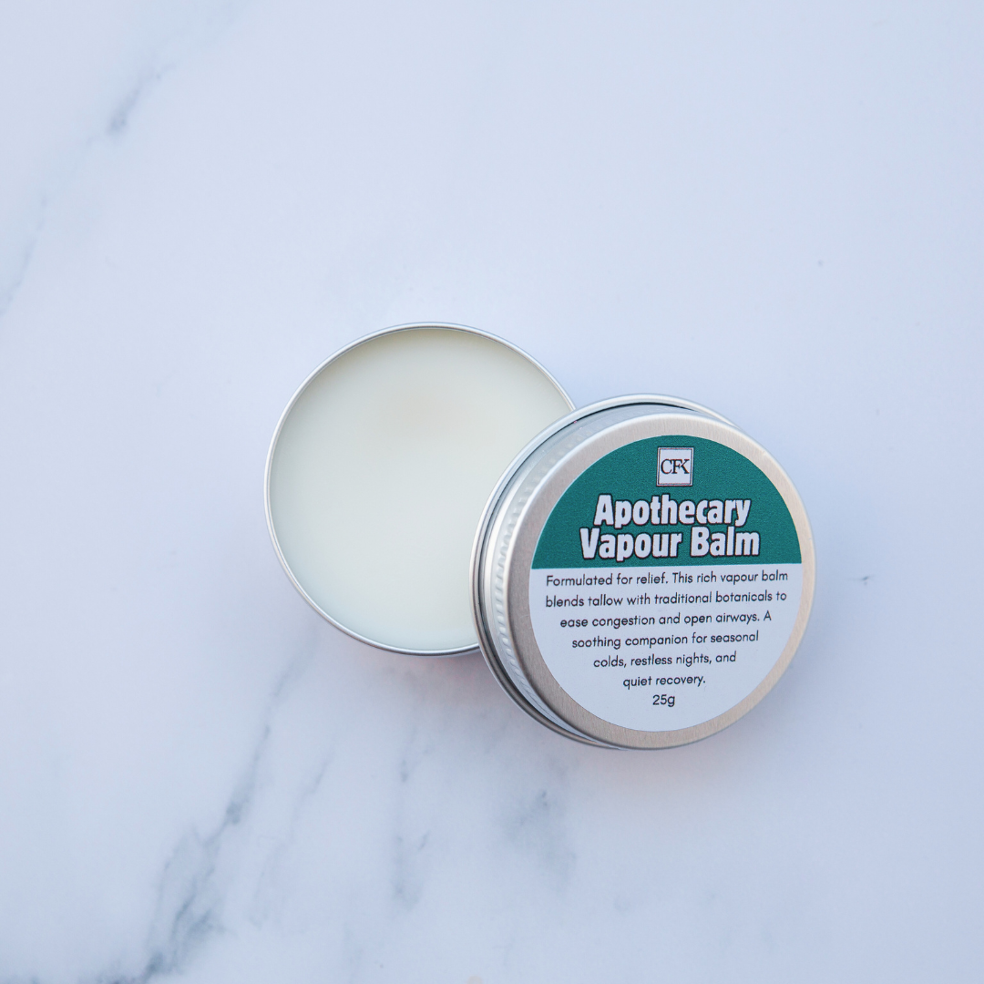 Formulated for relief. This rich vapour balm blends tallow with traditional botanicals to ease congestion and open airways. A soothing companion for seasonal colds, restless nights, and quiet recovery.