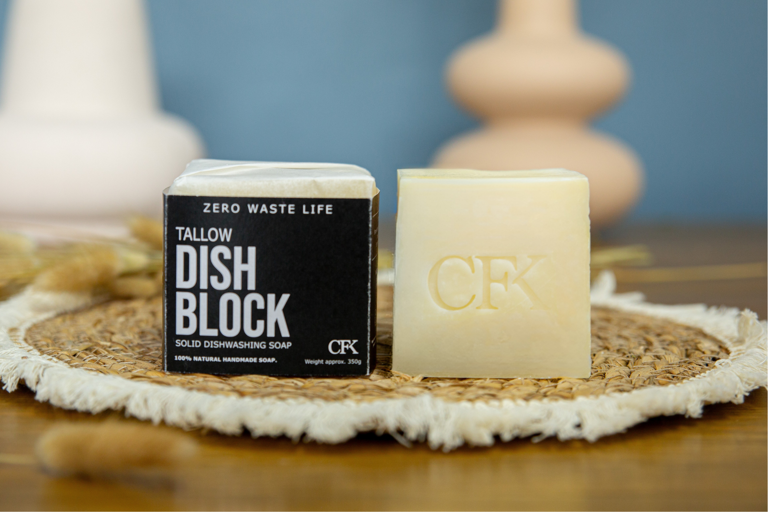 Cold process tallow dish block, handcrafted and formulated as a powerful multi-purpose cleaner in and around the kitchen.