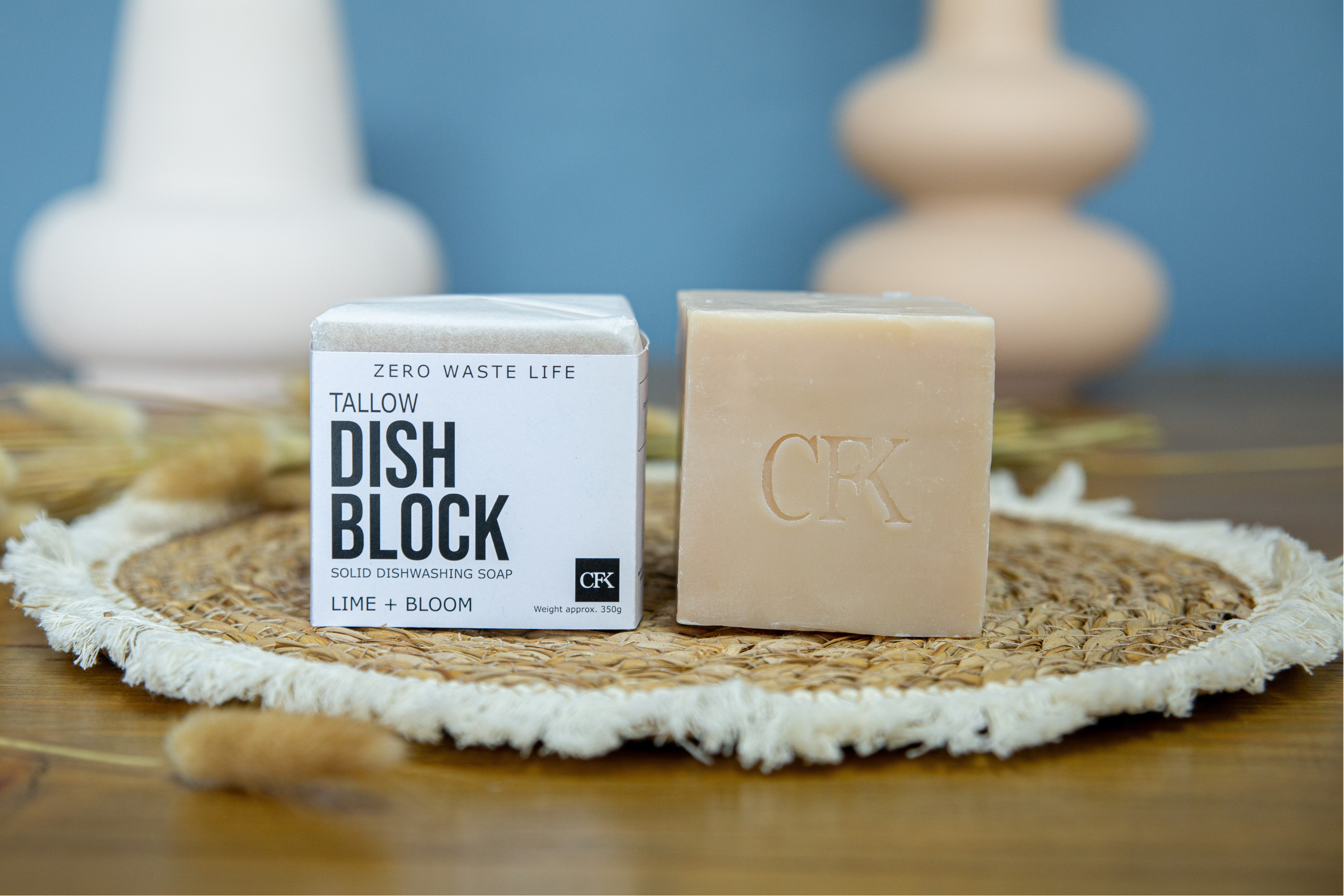 Cold process tallow dish block, handcrafted and formulated as a powerful multi-purpose cleaner in and around the kitchen.