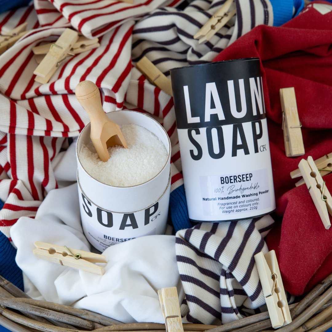 Our powdered Boerseep is naturally fragrance-free, biodegradable and washing machine safe.